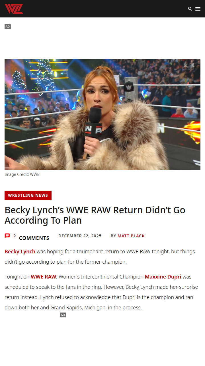 Angela Davis+FollowThe Man vs Maxxine: RAW Drama UnfoldsBecky Lynch’s much-hyped RAW comeback turned chaotic after she crashed Maxxine Dupri’s segment, refusing to recognize the champ. The Man went full throttle, laying out Dupri and even snatching the Intercontinental Title. But Maxxine wasn’t done—she locked in a vicious ankle lock, forcing Lynch to tap out in front of the WWE Universe. Now, a rematch is set for January 5. Did Maxxine prove Lynch’s best days are over, or is The Man just getting started? #Sports #Wrestling #WWERAW01Share