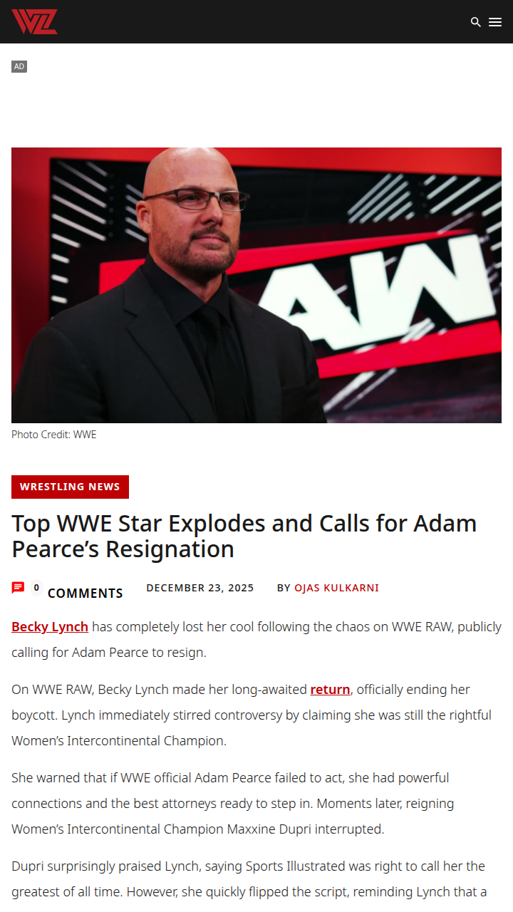 dbrown+FollowBig Time RAW Chaos: The Man vs PearceDid you catch Becky Lynch’s wild RAW return? The Man came back swinging—literally—calling out Adam Pearce and demanding his resignation after that heated showdown with Maxxine Dupri. Lynch insists she never tapped, blaming Pearce for the chaos and hinting at some serious backstage collusion. The WWE Universe is buzzing: Was Pearce out of line, or is Becky just stirring the pot? This rivalry just got personal! #Sports #Wrestling #WWERAW60Share