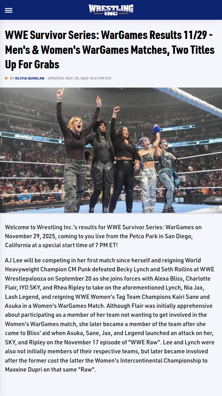 Diamond Horton+FollowSurvivor Series 2025: WarGames Shocker!What a wild night at WWE Survivor Series: WarGames 2025! The Women’s WarGames match stole the show, with AJ Lee making a triumphant return and tapping out The Man, Becky Lynch, after a brutal brawl. The real drama? In the Men’s WarGames, a hooded figure cost CM Punk and the Bloodline the win, letting The Vision and The Beast Incarnate, Brock Lesnar, walk away victorious. Who else thinks this mystery attacker just ignited a new rivalry? #Sports #Wrestling #WWESurvivorSeries131Share