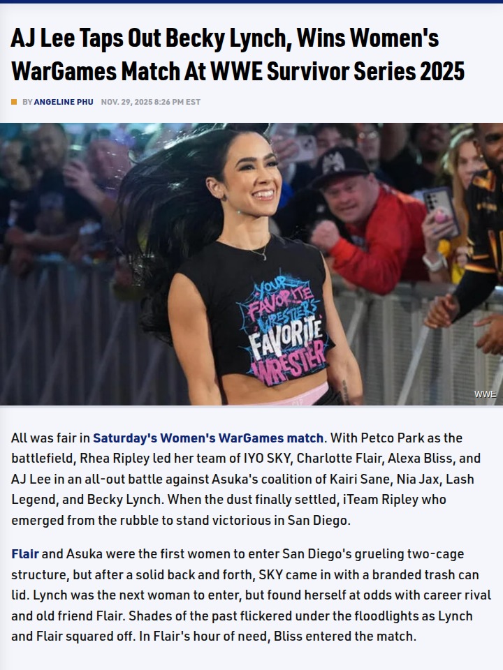 reneewang+FollowAJ Lee Shocks Becky at Survivor Series!Wow, what a finish at WWE Survivor Series 2025! AJ Lee made her WarGames debut unforgettable by forcing The Man, Becky Lynch, to tap out with the Black Widow. The tension between Lynch and Flair was real, but it was Lee’s high-flying cage entrance and submission skills that stole the show. Team Ripley’s strategy paid off big, and now AJ joins Bliss and Flair as undefeated in WarGames. Did you expect Lee to be the one to end it? Let’s talk about that epic rivalry! #Sports #Wrestling #WWESurvivorSeries413Share