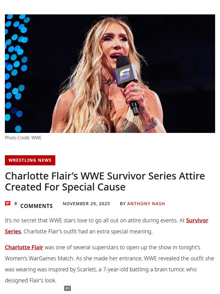 Kendra Ward+FollowCharlotte Flair’s Survivor Series TributeHow about that entrance from The Queen at Survivor Series 2025? Charlotte Flair’s WarGames gear wasn’t just another showstopper—it was designed by 7-year-old Scarlett, who’s battling a brain tumor. Seeing Flair meet Scarlett at ringside was a real heartwarming moment. Plus, Flair’s team, stacked with stars like Rhea Ripley and IYO SKY, pulled off a big win. What did you think of the tribute gear and the match outcome? Let’s hear your thoughts! #Sports #Wrestling #WWESurvivorSeries121Share