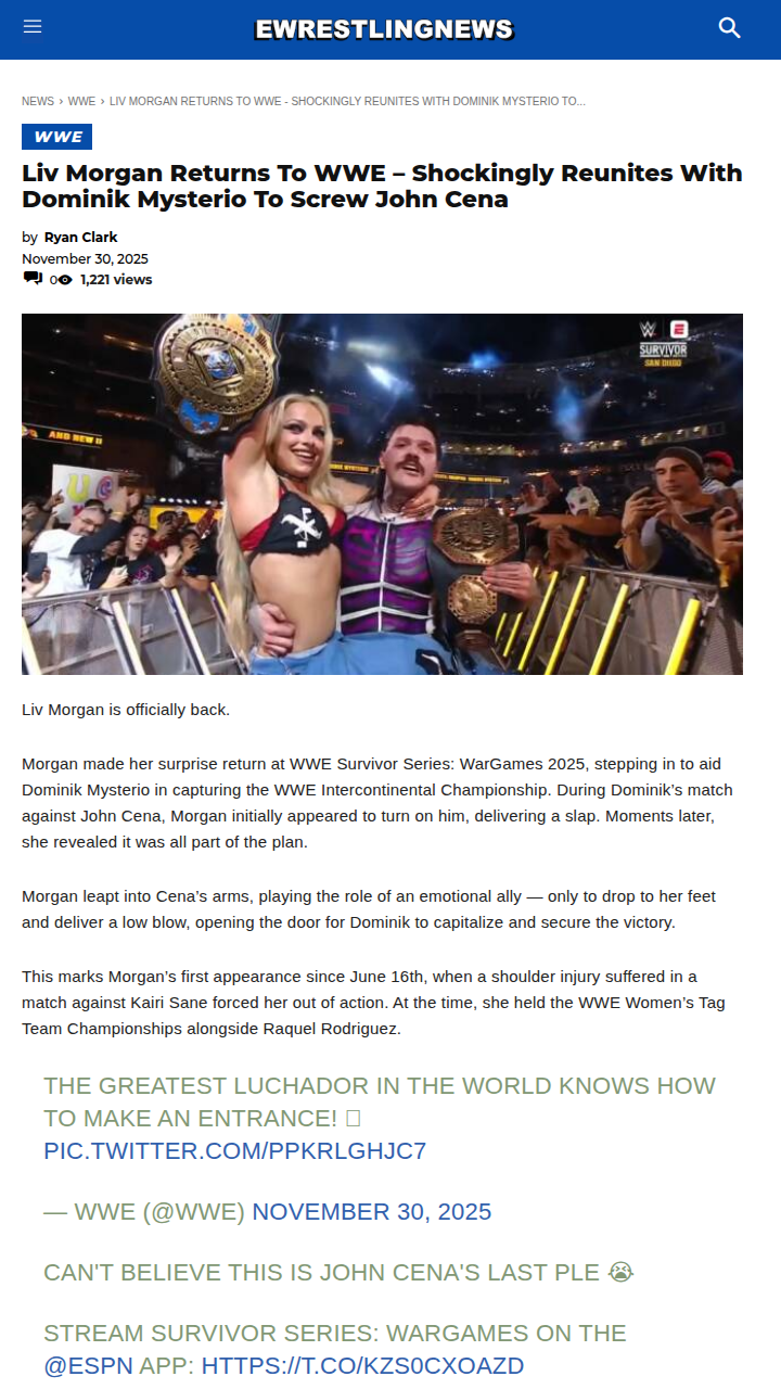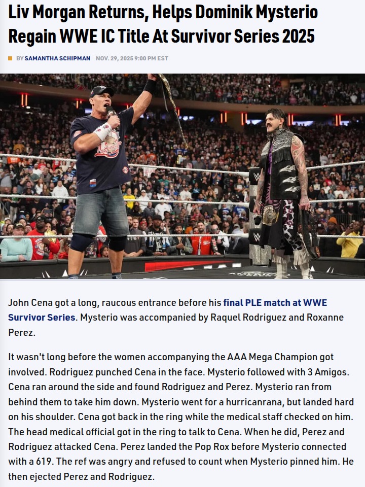 Angela Davis+FollowLiv Morgan Shocks Survivor Series 2025Did anyone see Liv Morgan’s return coming at Survivor Series 2025? Just when it looked like Cena had the IC Title in his grasp, Liv pops up, giggles with Dirty Dom, then turns on Cena with a low blow! That let Mysterio hit the Frog Splash and regain the gold. The ref drama and outside interference made this one wild. Is this the most controversial finish of the year or what? #Sports #Wrestling #WWESurvivorSeries10Share