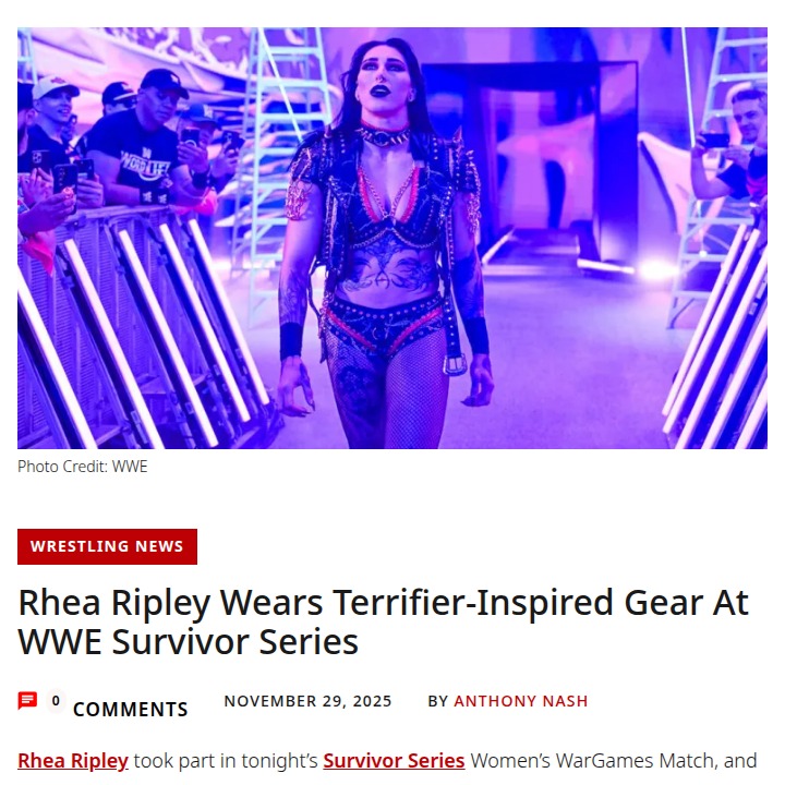 Kayla Mcconnell+FollowRhea Ripley’s Terrifier Look Steals Survivor SeriesMAMI brought the horror to WWE Survivor Series 2025! Rhea Ripley rocked a jaw-dropping Terrifier-inspired outfit—complete with an Art the Clown mask and blood-splattered gear. Not only did she turn heads with her entrance, but she also helped her team (with Queen Charlotte, IYO SKY, Alexa Bliss, and AJ Lee) clinch a huge WarGames win over Becky Lynch’s squad. Did Ripley’s horror vibes give her team the edge, or was it just classic MAMI dominance? #Sports #Wrestling #WWESurvivorSeries224Share
