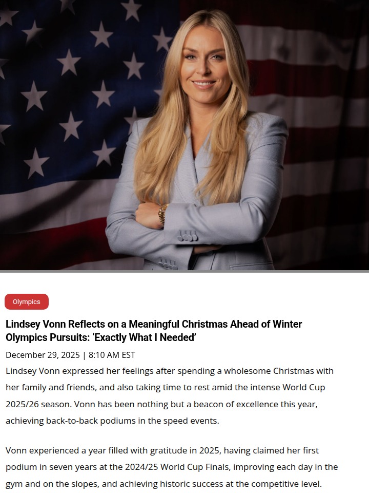 Judith Nelson+FollowLindsey Vonn’s Christmas Reset Fuels Olympic HopesLindsey Vonn, the Queen of Speed, just showed us all how to balance life and legacy. After a cozy Christmas with her crew, Vonn’s back in the gym, eyes locked on the 2026 Cortina Olympics. Her comeback story is wild—first World Cup podium in 7 years, a gold in St. Moritz, and now pushing boundaries at 41. Can Vonn rewrite the record books again? Her journey is pure inspiration for anyone chasing dreams, no matter the age. #Sports #LindseyVonn #WinterOlympics50Share