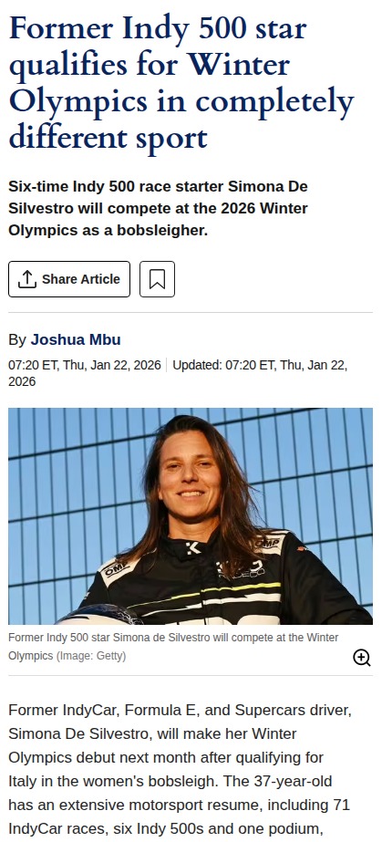Judith Nelson+FollowIndy 500 Ace Shifts Gears for Olympic BobsleighSimona “Iron Maiden” De Silvestro, best known for her IndyCar heroics, just qualified for the Winter Olympics—this time as a bobsleigh pilot for Italy! Swapping the roar of engines for the ice track, she’s breaking new ground, aiming to make history in her home country. Can her racing instincts give her an edge against traditional track stars? This crossover is one for the ages! #Sports #SimonaDeSilvestro #WinterOlympics00Share