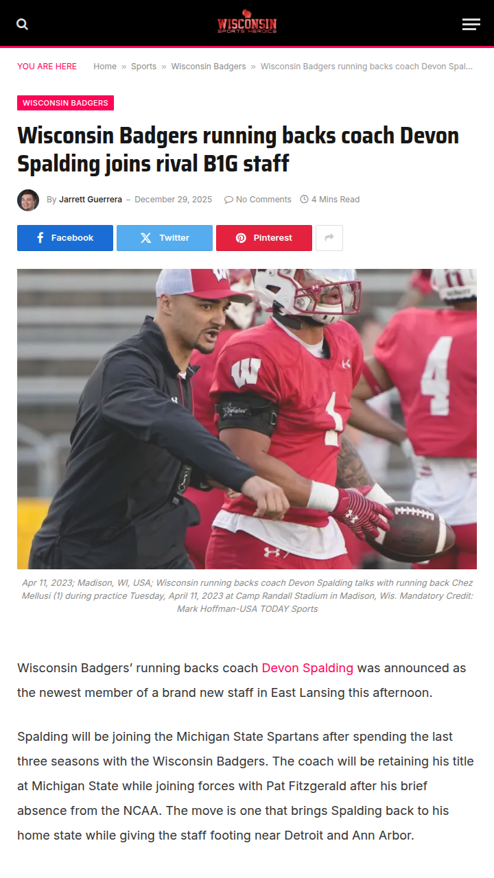 Amy Williams+FollowBadgers lose RB coach to Michigan State rivalDevon Spalding, Wisconsin’s running backs coach, is heading home to Michigan State, joining Pat Fitzgerald’s new staff. This move shakes up the Badgers’ program, especially after a couple of tough seasons for their run game. Now, Wisconsin is searching for a new coach to help develop top recruits like Darrion Dupree and Dilin Jones and get the ground game back on track. Some fans are already buzzing about possible replacements, including Badgers alum James White. How do you feel about Spalding’s departure, and who would you want to see leading the RB room next season? #Sports #Football #WisconsinBadgers00Share
