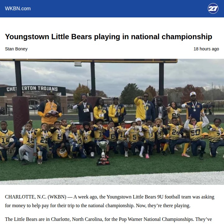 Christopher Hughes+FollowYoungstown’s Little Bears make history!Youngstown’s Little Bears just pulled off a jaw-dropping 33-0 shutout to win the Pop Warner Super Bowl, and the whole city is buzzing! This isn’t just about a trophy—it’s a huge moment for our community, showing what’s possible when kids have real support and encouragement. These young athletes, along with their coaches and families, have put Youngstown on the national map. It’s inspiring to see what teamwork, mentorship, and community spirit can achieve. How do you think this win will impact youth sports and opportunities for kids in our area? #Sports #Football #Youngstown00Share