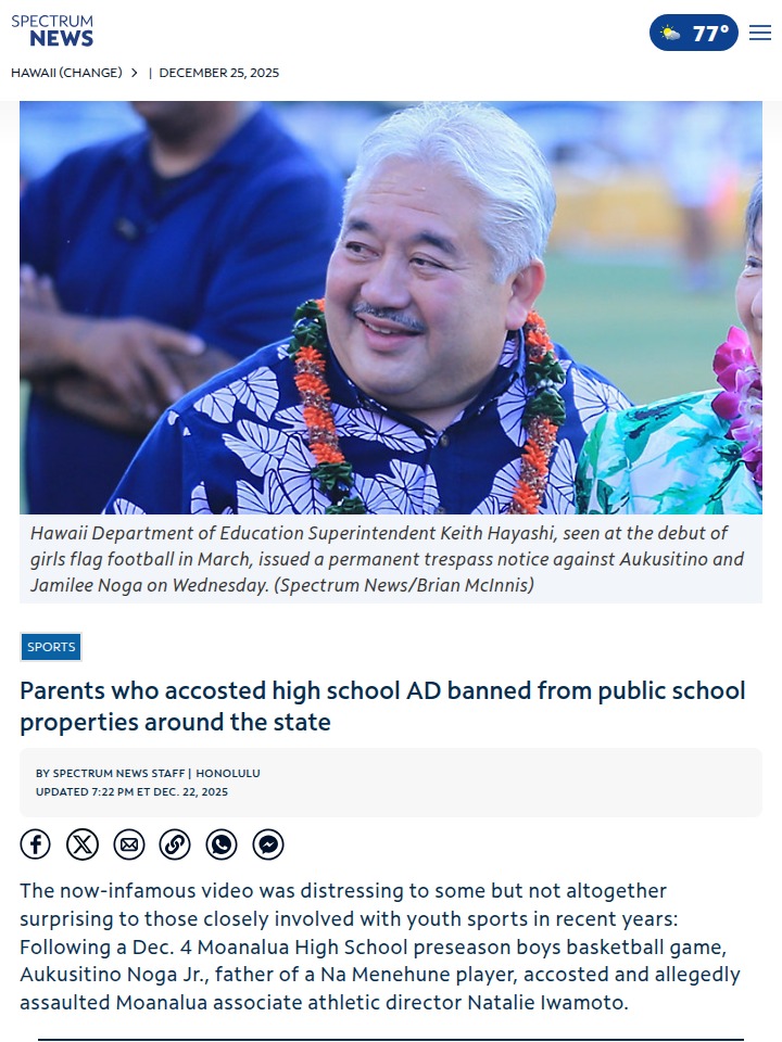 andersonkaren+FollowLifetime ban after Moanalua sports incidentA lifetime ban from all Hawaii public school properties has just been handed down to the parents involved in the Moanalua High School basketball incident. This is the first time such a sweeping ban has been issued statewide, and it’s a direct response to rising aggression at youth sports events. Many in the community are worried—if parents can’t keep their cool, what message does that send to our kids? With more officials quitting and games getting harder to manage, how do we restore respect and safety at school sports? #Sports #Moanalua #YouthSports00Share