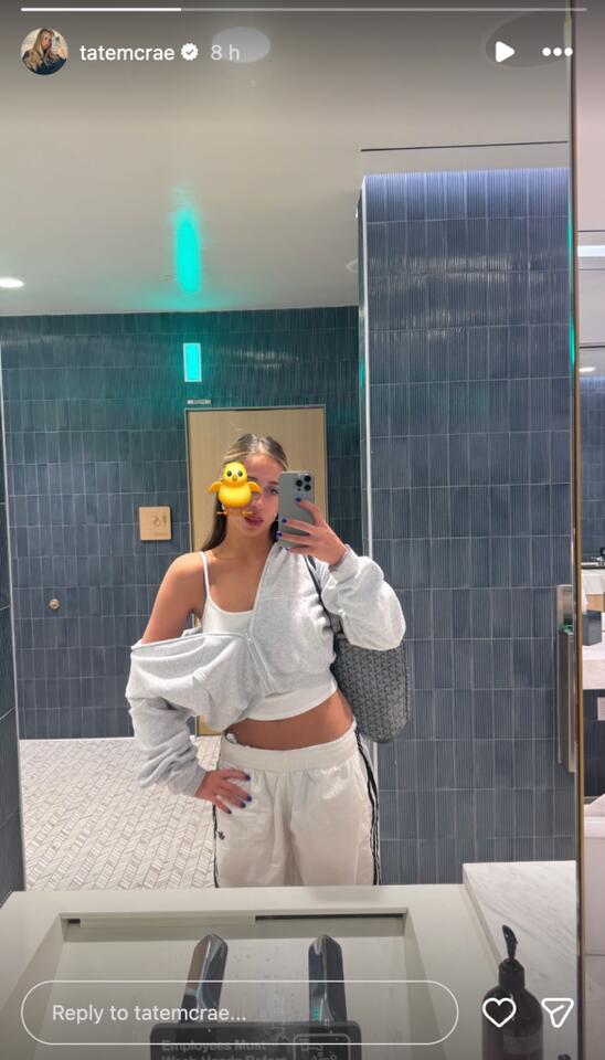 david80+FollowTate McRae’s Mirror Selfie Is a VibeTate McRae just dropped a mirror selfie on her IG Story and it’s a whole mood. She’s rocking a white cami, unzipped gray hoodie, and classic Adidas track pants—plus a monogram bag and those bold blue nails. The best part? She covered her face with a duck emoji, keeping it mysterious. If you needed sporty-chic inspo, this is it! #Beauty #TateMcRae #OOTD20Share