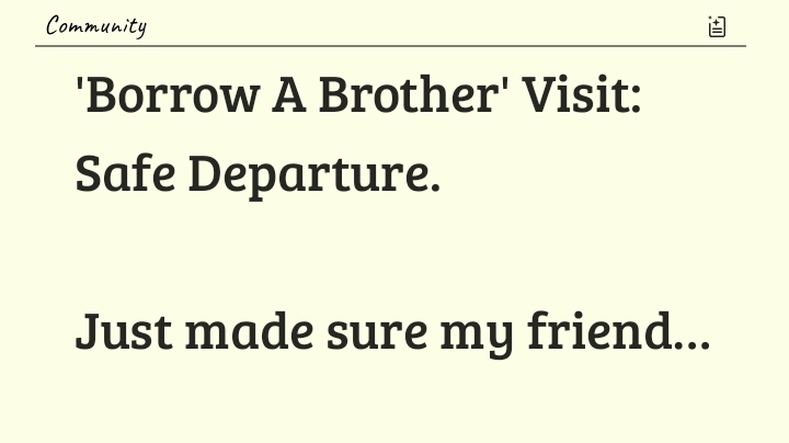 Cap Black+Follow'Borrow A Brother' Visit: Safe Departure. Just made sure my friend who's recovering from knee surgery had safe departure for a doctor's appointment. Please pay extra attention to each other during the holidays because some want to make them 'horror days' for folks. Cap Black #borrowabrother #safetyescort #volunteersecurity #securityvolunteer #volunteer20Share