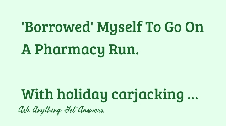 Cap Black+Follow'Borrowed' Myself To Go On A Pharmacy Run. With holiday carjacking and robbery in mind, I offered to ride along with my friend recovering from knee replacement surgery while she picked up some prescriptions. A police cruiser was parked in the pharmacy's lot near its drive through, with its blue lights on, doing an off duty security detail to deter robbery. 'Tis the season' as the saying goes. Cap Black #borrowabrother00Share
