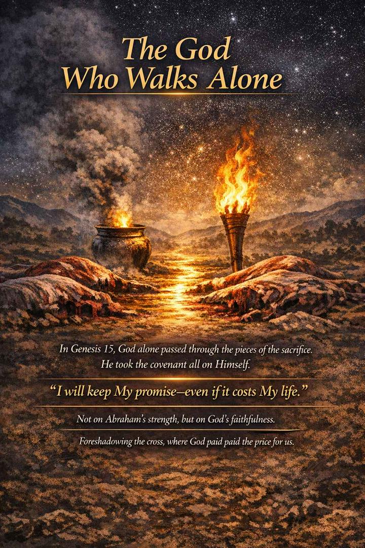 Yehudah HaLevi+FollowSpirit and Truth Devotional: The God Who Walks Alone In Genesis 15, Abraham watches as a smoking firepot and a flaming torch—symbols of God’s holy presence—move between the pieces of sacrificed animals. In ancient covenants, both parties walked this path to say, “If I break this promise, let me be torn apart like these animals.” But Abraham never walks through. God walks alone. By doing this, God declares that the covenant does not rest on Abraham’s strength, obedience, or perfection. It rests entirely on God’s own faithfulness. He takes full responsibility for fulfilling His promise, even at the cost of His own life. This moment foreshadows the cross, where God Himself bears the consequences of humanity’s covenant-breaking (God the Son—was “torn apart” for the covenant breakers). The God who walked alone between the pieces is the same God who walks faithfully with you today. His promises do not depend on your perfection but on His unchanging character. Trust his faithfulness and rest in his grace. #Devotional #DevotionalStudy #Jesus #God170Share