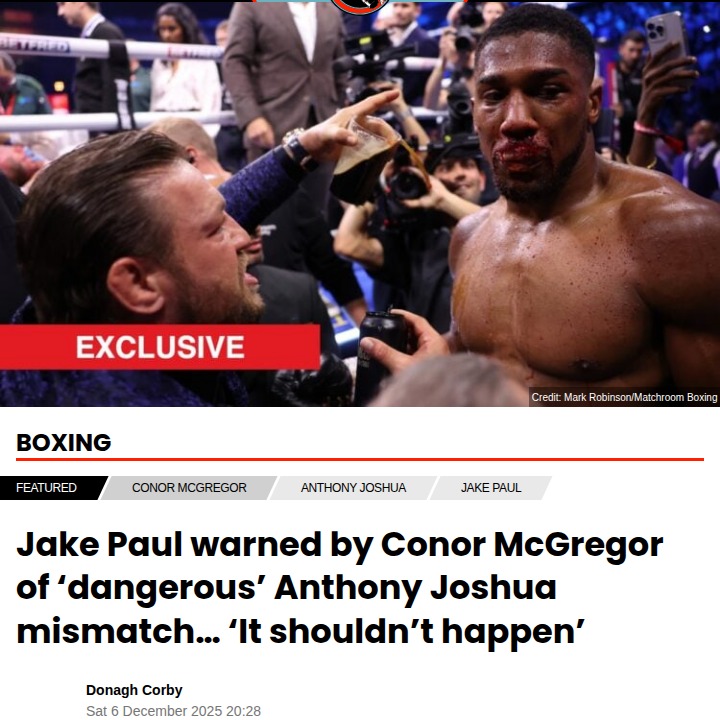 Cathy Sullivan+FollowMcGregor: Paul vs Joshua Is Too RiskyNotorious himself, Conor McGregor, just sounded the alarm for Jake Paul’s upcoming clash with AJ. McGregor says there’s a real darkness in Anthony Joshua that the Problem Child can’t overlook. If Jake actually steps in the ring with the two-time heavyweight champ, Conor says he’ll finally give him respect—but warns this is a mismatch that could end badly. Is this Netflix-fueled fight a step too far for Jake? Let’s hear your takes below! #Sports #Wrestling #JakePaul10Share