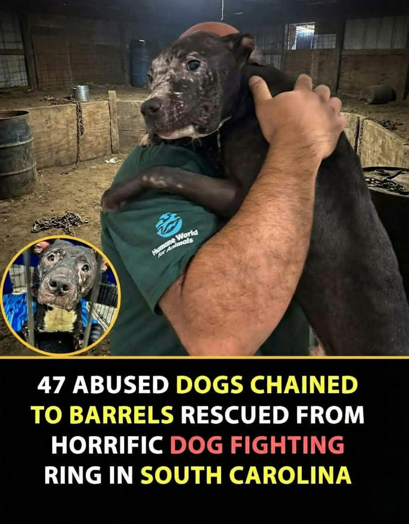 After years of unimaginable abuse, 47 dogs have finally been freed from a horrific dogfighting ring in South Carolina. When authorities discovered them, they were chained to metal barrels, shaking in the cold, with barely any food, inconsistent water, and no real shelter or comfort. Many carried visible evidence of what they had endured—infected injuries, damaged teeth, and scars that told stories of fights they never chose. Rescuers say the dogs were frightened and confused at first. They didn’t know how to respond when humans approached them with kindness instead of cruelty. After a lifetime of pain, gentle touch felt strange and unfamiliar. But as the chains were removed, something shifted. Slowly, tails began to wag. A few dogs cautiously leaned into a caring hand, as if realizing—for the first time—that they were safe. Today, all 47 dogs are receiving veterinary care, nutritious food, and patient, loving attention. They’re learning what it means to rest without fear, to eat peacefully, and to experience touch without harm. Despite everything they’ve endured, many are already showing how resilient they are—and how deeply they still want connection, trust, and love. Authorities are now working to hold those responsible accountable, hoping this case will lead to real justice and prevent future cruelty. These dogs have witnessed humanity at its worst, but now they’re finally beginning to see its best. #enddogfighting #saveanimals #JusticeForAnimals #DogsDeserveBetter #kindnessmatters