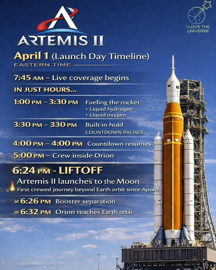 justme +Follow🚀 TODAY IS THE DAY. After more than half a century… humanity is returning to deep space. In just hours, the Artemis II mission will carry astronauts around the Moon — the first crewed journey beyond Earth orbit since Apollo. Not a test. Not a simulation. This is real. And it’s happening NOW. 🕒 LAUNCH DAY TIMELINE (EDT) 🌅 7:45 AM – Live coverage begins The world wakes up. The mission starts. ⛽ ~1:00 PM – 3:30 PM – Fueling the rocket Hundreds of thousands of liters. One chance. ⏸️ ~3:30 PM – Built-in hold A pause before history moves forward. ▶️ ~4:00 PM – Countdown resumes No turning back. 👨🚀 ~5:00 PM – Crew inside Orion The hatch closes. Silence. Focus. 🟢 ~5:30 PM – Final GO / NO-GO Every system. Every heartbeat. 🚀 6:24 PM – LAUNCH WINDOW OPENS 🔥 Target liftoff: 6:24 PM If all goes well… a new chapter for humanity begins in that exact moment. 🌌 What happens next? +8 minutes → The rocket reaches space +1 hour → Orion begins its journey to the Moon This is not just another launch. This is the moment we step back into the cosmos. Watch it. Feel it. Remember where you were. 🌍🌕🚀 #ArtemisII #NASA #MoonMission #Space #LaunchDay #HistoryInTheMaking01Share