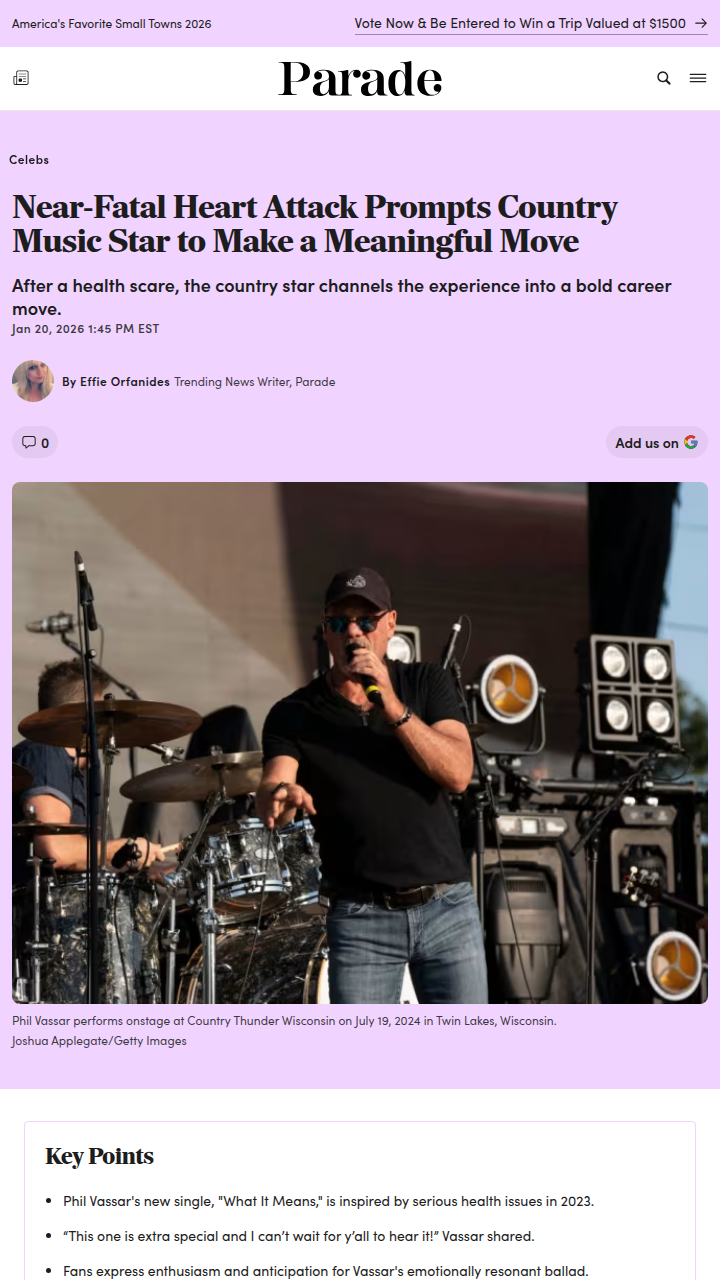 James Garner+FollowPhil Vassar’s Shocking Health Scare 😱Did anyone else know Phil Vassar’s new single was inspired by a near-fatal heart attack AND a stroke? He literally coded twice and had to relearn how to walk! Now he’s channeling all that trauma into his song “What It Means.” Some fans are saying this comeback is his most emotional yet, but others wonder if it’s just a publicity move. Is this the realest Vassar we’ve seen or just clever marketing? #Entertainment #Music #PhilVassar10Share