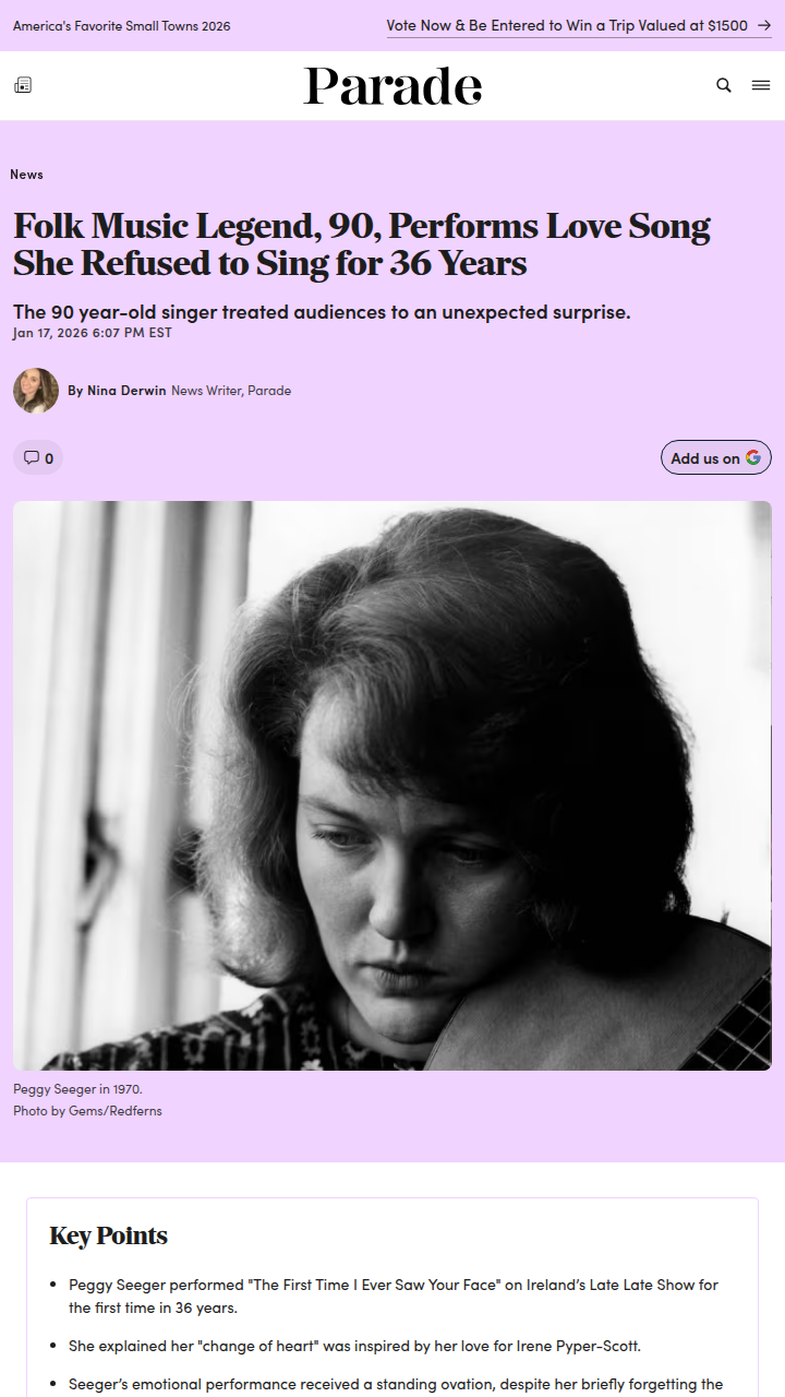 Courtney Brennan+FollowPeggy Seeger’s Love Song Twist! 🎤Peggy Seeger just shocked everyone by performing 'The First Time I Ever Saw Your Face' after refusing to sing it for 36 years! The real plot twist? She says she can finally sing it again because she’s found new love with Irene Pyper-Scott. Fans are now debating: was this a tribute to both her partners, or does it change the song’s meaning forever? #Entertainment #Music #PeggySeeger00Share