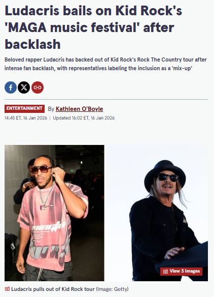 Courtney Brennan+FollowLudacris Drops Out of MAGA Fest Drama 😳Ludacris just vanished from Kid Rock’s Rock the Country lineup after fans called him out for even being associated with a MAGA-leaning festival. His rep claims it was a 'mix-up,' but the timing is way too sus. Meanwhile, Nelly’s still performing and doesn’t seem bothered by the backlash. The fandom is totally split—some say Luda dodged a bullet, others think he caved to pressure. What’s your take on this mess? #Entertainment #Music #Ludacris180Share