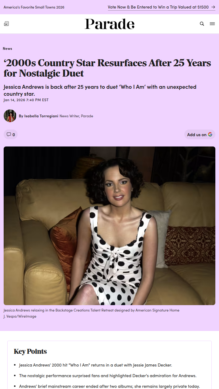 Jay Carter+FollowJessica Andrews’ Surprise Comeback Duet! 🎤Jessica Andrews just popped up out of nowhere for a nostalgic duet with Jessie James Decker, and fans are losing it! After 20+ years off the radar, Andrews’ voice still hits hard, but the real tea? Some are saying Decker’s version outshines the original! Is this the comeback we’ve been waiting for, or is it all about Decker now? Let the debate begin! #Entertainment #Music #JessicaAndrews00Share