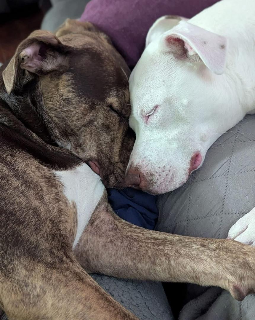 The white dog has severe PTSD and hadn’t slept through the night in years. The brindle dog figured out the cure in one night. I haven’t bought a second dog bed in three years. It would be pointless. They wouldn’t use it. The white one—Casper—came to me broken. He spent his first two years locked in a crate in a dark garage. When I adopted him, the vet called it “separation panic.” If the room went dark, he screamed. If he couldn’t see me, he shook. He was terrified that if he fell asleep, he’d wake up back in that crate. He never slept more than 20 minutes at a time. Then came the brindle one—Bruno. A former street stray. Scarred, solid, completely unbothered by the world. I worried he’d be too rough for fragile Casper. I was wrong. The first night Bruno came home, Casper began his usual pacing and whining when the lights went out. Bruno didn’t growl or snap. He simply walked to the dog bed, laid down, sighed deeply, and looked at Casper. Casper hesitated. One step. Then another. He lay down beside him. Then Bruno did something I’ll never forget. He scooted closer and pressed his heavy forehead gently against Casper’s face—like he was blocking the panic itself. It was as if he said, “I’ve got the watch tonight. You can rest.” Casper released a breath he’d been holding for two years. His eyes closed. He slept for eight straight hours. That was three years ago. They’ve slept like this every night since—forehead to forehead, nose to nose. Calm passing from one soul to the other. When Casper twitches in a nightmare, Bruno presses just a little harder, grounding him back. They say you can’t save them all. But sometimes, you save the one who saves the other. I went in for one and came home with soulmates. ❤️ Do you have pets who are inseparable? #rescuedogs #animallover 🐾
