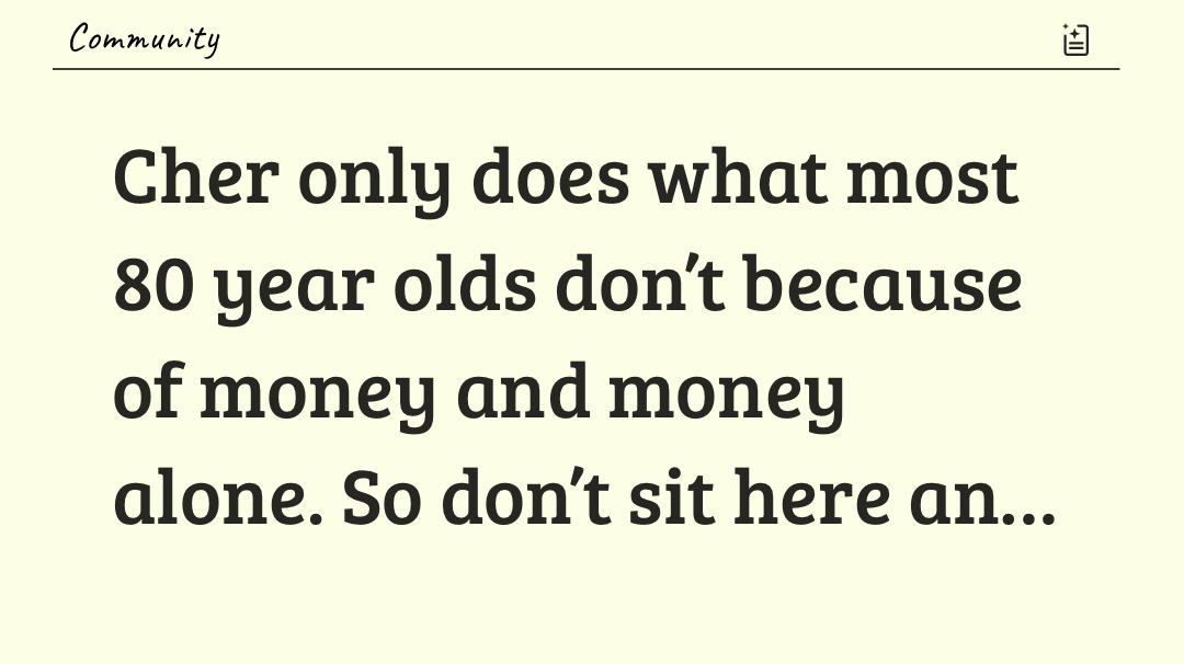 Jeremy Seward+FollowCher only does what most 80 year olds don’t because of money and money alone. So don’t sit here and act like it’s her fu*kin genes because it’s not, it’s quite the opposite actually. It’s not fair to compare her age with others her same age UNLESS they too have dr’s and surgeons around the clock. She has more dr’s and nurses round the clock than a care home and hospice facility combined.. Leavitt isn’t off the hook by me saying this I’m just stating the reality you are actually faced with when talking about Cher!! Bless her heart but real is real.01Share