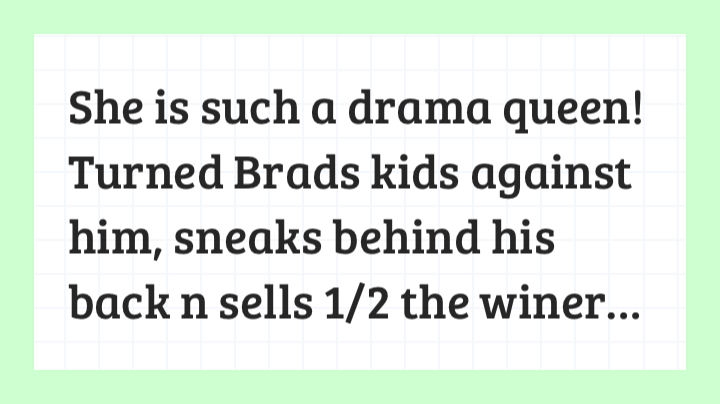 LadyBug🐞+FollowShe is such a drama queen! Turned Brads kids against him, sneaks behind his back n sells 1/2 the winery, blames Brad for her health, states she’s broke because Brad keeps her in court cases, and decides to when he can see the kids, grandparents never getting to know their grandchildren, all this from her sleeping with a married man n breaking up a marriage and she wants the public to believe she is the better parent? She is a nut case only out to destroy Brad because if she can’t have him no one can. Evil person00Share