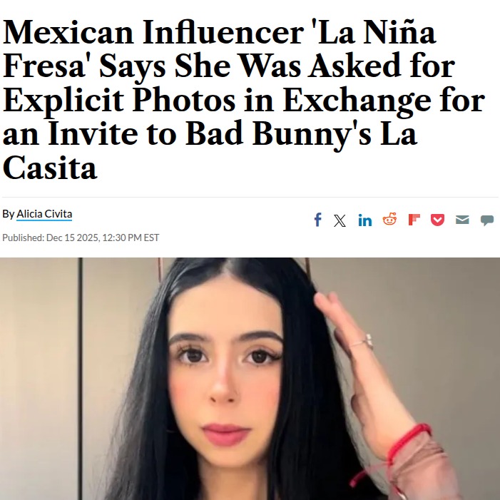James Hall+FollowLa Niña Fresa Drops Bombshell on Bad Bunny's Crew 😳Did anyone else see La Niña Fresa’s interview? She claims someone from Bad Bunny’s team asked her for sexy pics just to get into La Casita at his Mexico City concert! She even said she already had a ticket, so it wasn’t about freebies. Now fans are debating if this is a shady team move or just a clout-chasing story. What do you think—legit scandal or overblown drama? #Entertainment #Celebrity #BadBunny00Share