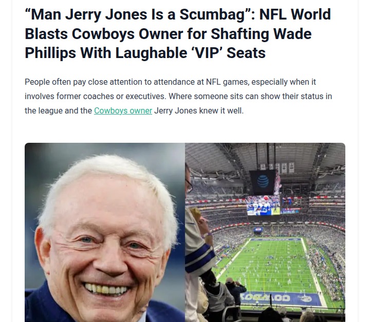phughes+FollowJerry Jones Disrespects Wade Phillips?Cowboys Nation, did you see the drama with Jerry Jones and former head coach Wade Phillips? During Sunday Night Football, Phillips—who once broke our playoff drought—was stuck in the nosebleeds, despite being promised prime 50-yard line seats. Fans lit up social media, calling out Jerry for not showing proper respect to a legendary defensive mind. Is this just classic Jerry, or should legends get better treatment? Let’s hear your thoughts! #Sports #Football #CowboysNation00Share