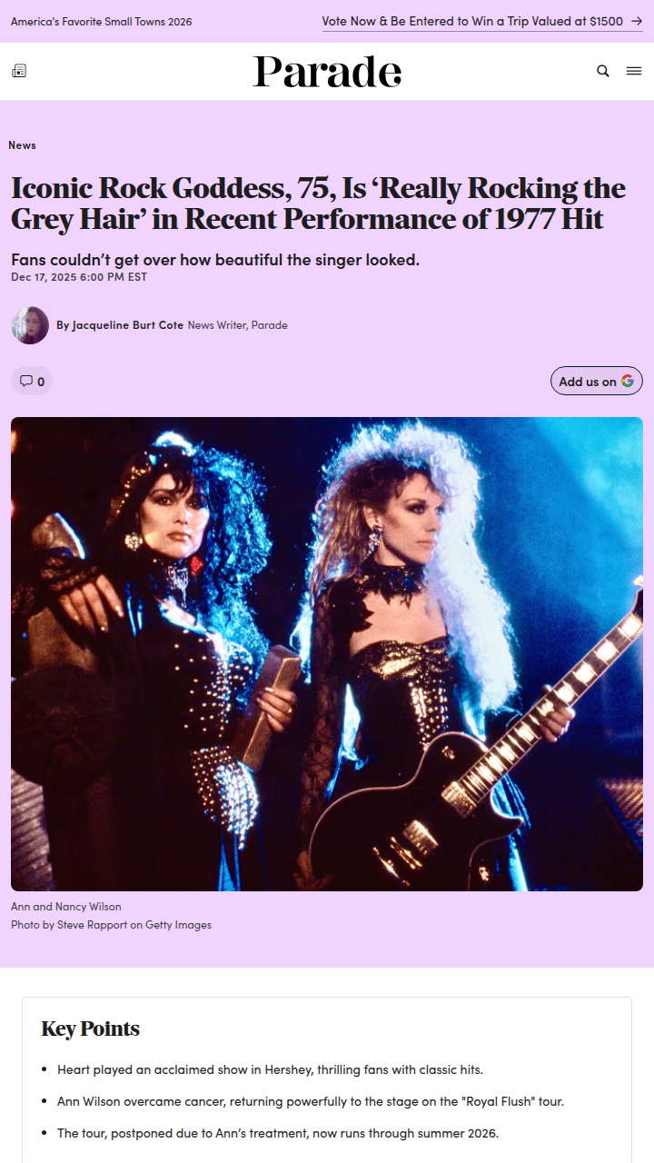Casey Sutton+FollowAnn Wilson’s Silver Hair Stuns Fans 🤩Ann Wilson just proved age is nothing but a number! Heart’s latest performance had everyone buzzing—not just for their killer “Barracuda” set, but for Ann’s gorgeous grey curls. The fandom is split: some say she’s redefining rock style, others wish she’d go back to her iconic dark hair. But after her cancer battle, seeing her rock out with confidence is honestly inspiring. Are we witnessing a new era for Heart? #Entertainment #Music #Heart00Share