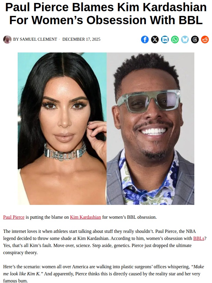 Eddie Deleon+FollowPaul Pierce Drops Hot Take on Kim K & BBL CrazeThe Truth is out—Paul Pierce just went full conspiracy mode on his podcast, blaming Kim Kardashian for the BBL trend taking over America. The former Celtics star says Kim K’s influence is so strong, it’s got women everywhere asking surgeons for that signature look. Whether you buy The Truth’s theory or not, it’s wild to see NBA legends weighing in on pop culture like this! What do you think—does Pierce have a point, or is he just stirring the pot? #Sports #PaulPierce #KimKardashian00Share