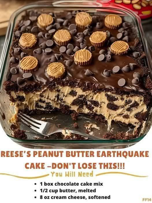 Little Miss Block The Haters+FollowReese’s Peanut Butter Earthquake Cake -Don't Lose This!!! Ingredients: - 1 box chocolate cake mix + ingredients to prepare - 1/2 cup butter, melted - 8 oz cream cheese, softened - 1/2 cup peanut butter - 1/2 tsp vanilla extract - 4 cups powdered sugar - 1/2 cup semi-sweet chocolate chips 1326Share