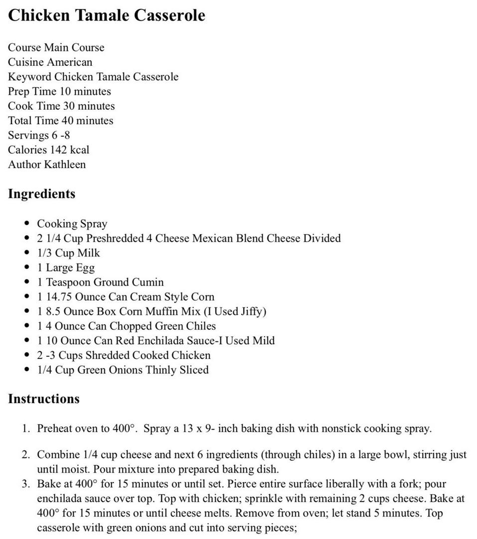 MLo888+Follow “Dinner win alert! 🍗🌽🧀 This Chicken Tamale Casserole is SO easy and packed with all the best flavors – sweet cornbread base, creamy corn, green chiles, enchilada sauce, tender chicken, and tons of melted cheese. Ready in just 40 minutes and feeds the whole family! Full recipe in the photo 👇 Has anyone tried this before? Drop your favorite casserole recipes in the comments – I need more ideas! #ChickenTamaleCasserole #EasyDinner #MexicanInspired #CasseroleRecipes #WeeknightMeals #ComfortFood” 81Share