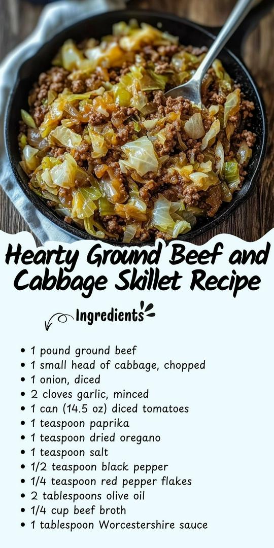 Latoria M⭐️+FollowHearty Ground Beef and Cabbage Skillet RecipeIngredients • 1 pound ground beef • 1 small head of cabbage, chopped • 1 onion, diced • 2 cloves garlic, minced • 1 can (14.5 oz) diced tomatoes • 1 teaspoon paprika • 1 teaspoon dried oregano • 1 teaspoon salt • 1/2 teaspoon black pepper • 1/4 teaspoon red pepper flakes • 2 tablespoons olive oil • 1/4 cup beef broth • 1 tablespoon Worcestershire3211124Share