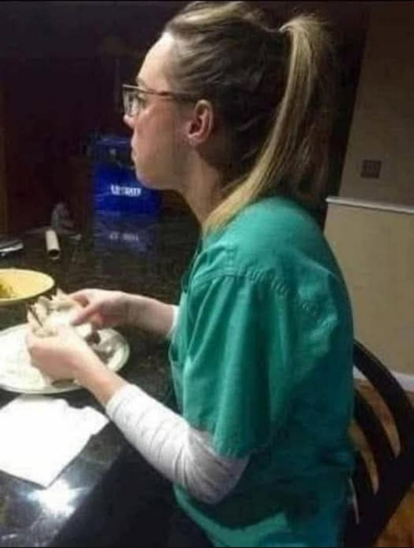 This is my wife Jessica having dinner after a 14 hour day. She comes home from work, has enough time to eat and get ready for bed and it's back to work the next day for another shift. She is up early to get ready for her day. She doesn't like to be bothered in the morning and I respect that. She showers throws her hair up, grabs her lunch gives the doq and me a kiss, and heads out the door At work, she takes care of people who are having the worst days of their lives. Strokes Car accidents, motorcycle accidents, falls, breaks, brain damage, and more. She takes care of mothers. fathers. sisters, brothers friends, and families. It doesn't matter who you are or what happened. She will take care of you.
