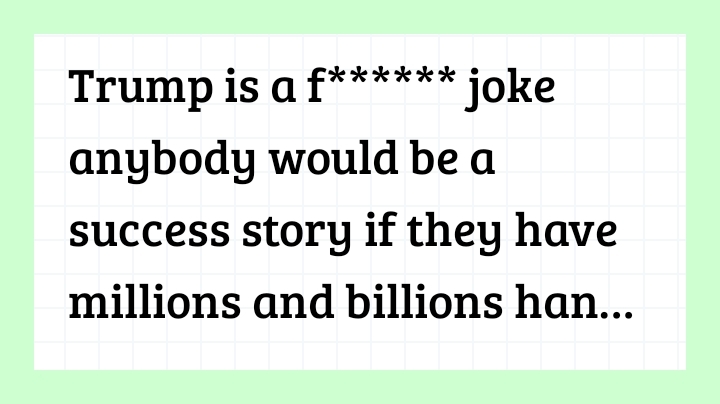 Josh Fields+FollowTrump is a f****** joke anybody would be a success story if they have millions and billions handed to them when they were kids he didn't work for s*** it didn't start anything from the ground up he didn't come out the mud a lot of people have this silver spoon I think that they're built like that knowing damn well they're not built like that at all stop with the acting real talk only people that came out the mud and actually made some other stuff this is success story not fake ass want to bees I hope his ass gets impeached f*** Trump ππππππππππππππππππππππππ124Share