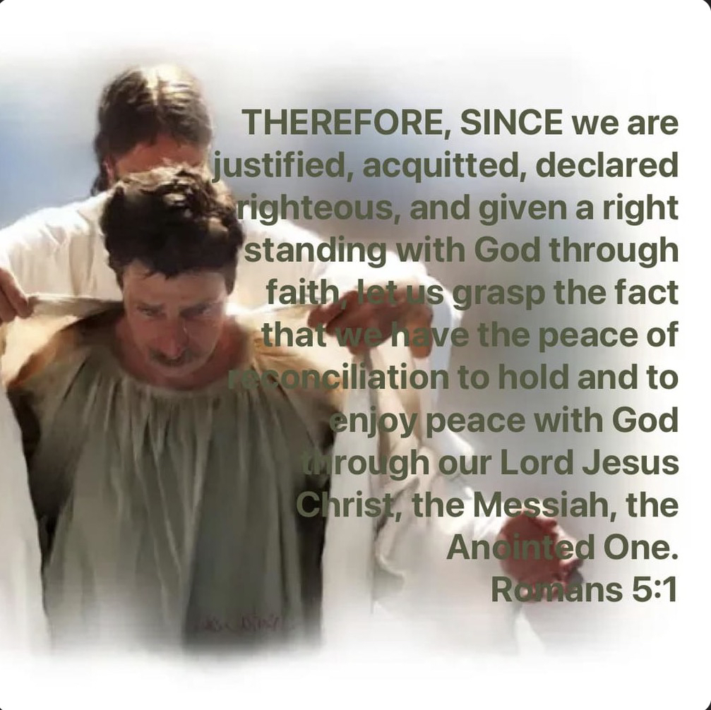 Romans 5:1 Therefore… Because of Who He is and what He’s done if we believe in Him, trust Him, surrender to Him… we’re justified by Him. Jesus’ life, His betrayal and death happened because of our sin. All this, and His resurrection, secured our acquittal, paid the penalty for our sin, absolving us from all guilt before God. Jesus didn’t just take away the penalty, He paid our ransom in full. Paul encourages the believers in Rome to fully grasp what all this means. His voice from so long ago continues to encourage us to do the same. Perhaps we realize what it truly means as the tears flow, and the words won’t come… anything we might say is inadequate to express the gratitude in our hearts. What’s it like to experience, to have the joy and peace of being reconciled to God? Is it an unburdened heart, one free of anxiety and hate? Is it coming face-to-face with Him, His hand in ours, leading us in the way we should go? Is it knowing, without a doubt, we’ve been fitted with the robes of righteousness, the clean linens only Jesus provides? Being justified by Faith is no small matter, God moved and heaven and earth, sacrificing Himself, His Son for us, you… me. On this side of heaven, we embrace the joy and the peace in being reconciled to God through Jesus. Speechless, in our minds we go over the fact He does it all… He gives everything… in order that we would receive it. This is love… From beginning to end, Love starts it … and finishes it. Nothing in this world can extinguish the Light, the joy and the peace in being justified…,reconciled to God through the blood of Jesus. Glory be to God in the Highest!