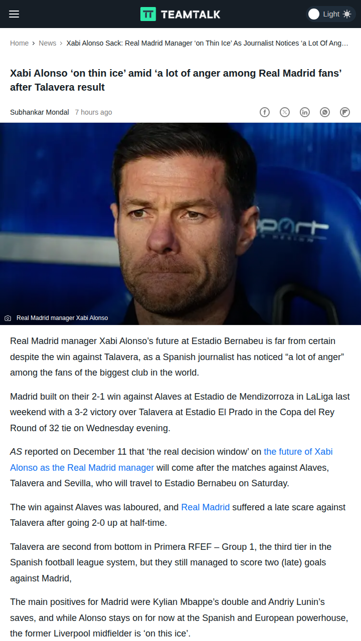 kochcandice+FollowXabi on Thin Ice After Talavera ScareLos Blancos just scraped past Talavera in the Copa del Rey, but Madridistas aren’t happy. Xabi Alonso’s squad went 2-0 up, only to let Talavera—second from bottom in the third tier—nearly force extra time. Even with Mbappe’s brace and Lunin’s heroics, fans are fuming over the late collapse. With the Sevilla clash looming, is Xabi’s job at the Bernabeu really safe? Let’s hear your takes: is the anger justified or just classic Madrid drama? #Sports #Soccer #RealMadrid00Share