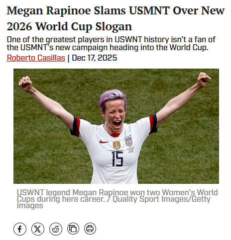 Jillian Morse+FollowRapinoe Roasts USMNT’s New SloganWow, Megan Rapinoe didn’t hold back on the USMNT’s new World Cup slogan, “Never Chase Reality.” On her podcast, she joked that it sounds like the guys already think they can’t win! As a legend who’s lifted the trophy twice, Rapinoe’s take definitely stirs the pot in the ongoing USWNT vs. USMNT rivalry. Do you think the slogan inspires, or is it a miss? #Sports #Soccer #USMNT00Share