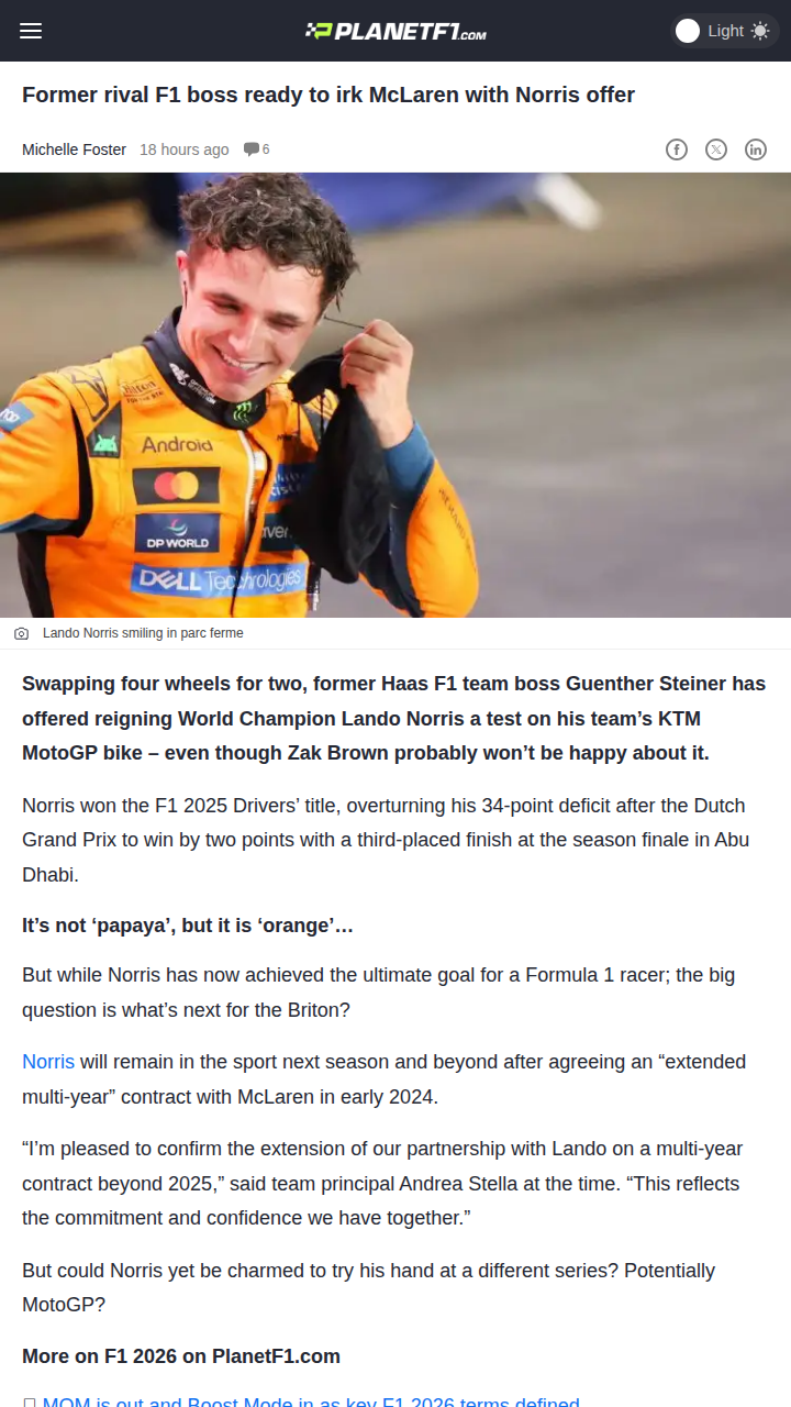 Jeremy Campbell+FollowNorris Tempted by MotoGP Test Ride?Lando “Last Lap Lando” Norris just clinched the F1 title in dramatic style, but now ex-Haas boss Guenther Steiner is stirring the pot by inviting him to test KTM’s MotoGP bike. Steiner’s cheeky offer could irk Zak Brown and McLaren, especially since Norris has a real passion for two wheels. Would you want to see Norris swap papaya for orange and take on MotoGP, even for a day? #Sports #Racing #F100Share
