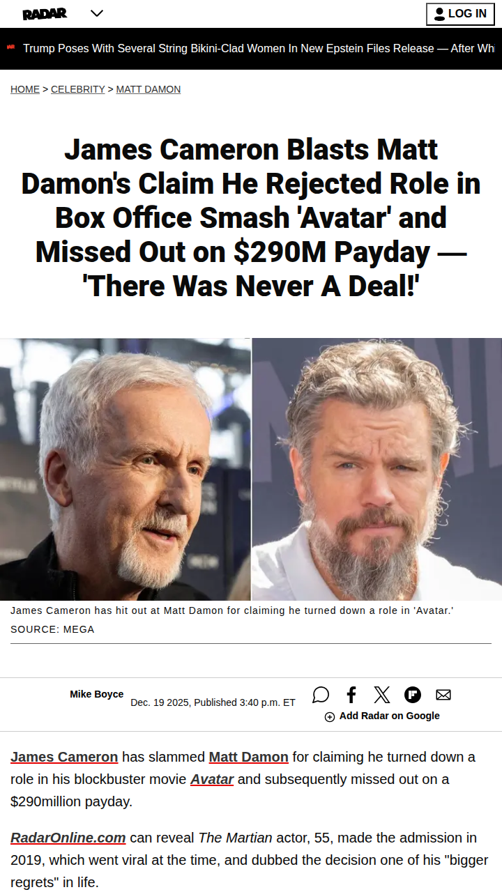 Jason Curtis+FollowAvatar Drama: Cameron vs Damon 💥James Cameron just shut down Matt Damon's viral story about turning down Avatar and missing out on $290M. Cameron says Damon was NEVER actually offered the role of Jake Sully—just a scheduling chat, no deal, no script, nothing! Fans are now split: Was Damon exaggerating, or is Cameron rewriting history? The debate is heating up as Avatar 3 buzz grows! #Entertainment #Movies #Avatar00Share
