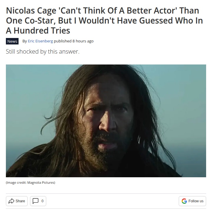Brittany Rios+FollowNicolas Cage's Shocking Pick for Best Co-Star 🤯Nicolas Cage just dropped a bombshell in a recent interview, saying Isla Johnston is the best actor he’s ever worked with—even over legends like Meryl Streep and Cher! Fans are split: is Cage hyping up his new movie, or is Johnston really that good? Some are even debating if this is just classic Cage trolling the press. Either way, The Carpenter’s Son just shot up my must-watch list! #Entertainment #Movies #NicolasCage00Share