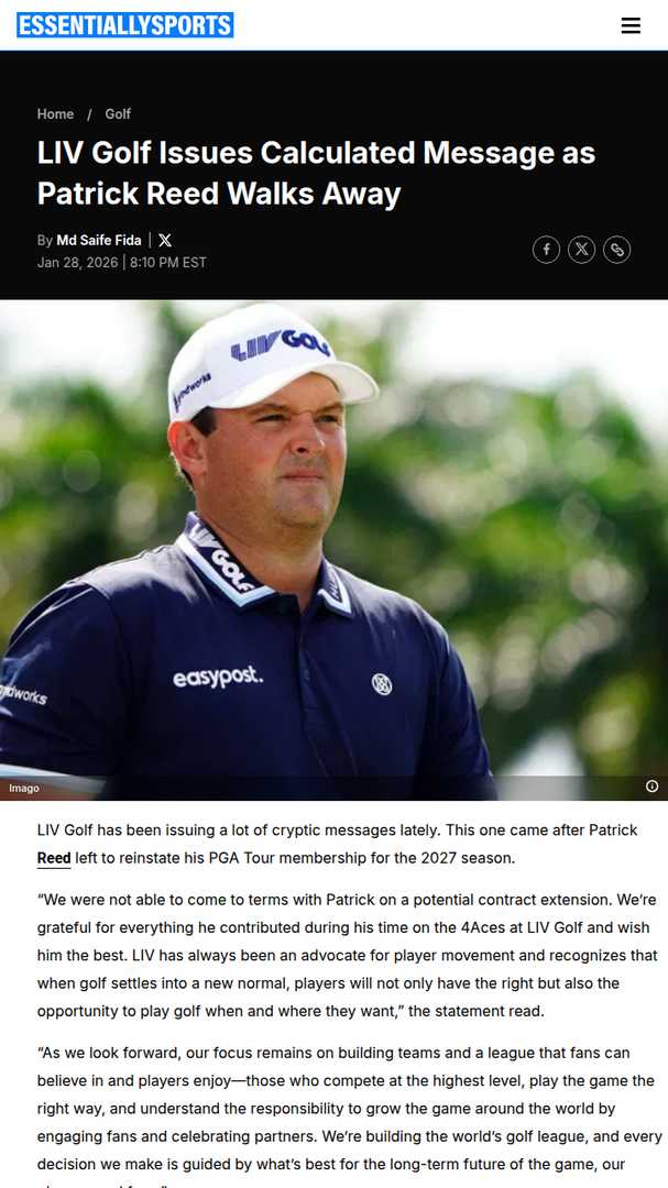 rmendoza+FollowCaptain America Reed Shakes Up LIV GolfWow, talk about drama! Captain America (Patrick Reed) just stunned the 4Aces and LIV Golf by walking away after his Dubai Desert Classic win. The league’s cryptic farewell hints at bigger shifts, especially with DJ locked in but Reed heading back to the PGA Tour. The rivalry between the legacy tours and LIV is heating up—can Reed reclaim his old glory, or will LIV regret letting him go? What’s your take on this wild turn? #Sports #Golf #PatrickReed00Share