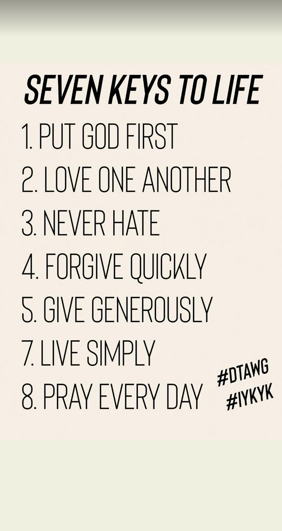 1. Put God First - But seek first his kingdom and his righteousness, and all these things will be given to you as well. (Matthew 6:33) 2. Love One Another - A new command I give you: Love one another. As I have loved you, so you must love one another. By this everyone will know that you are my disciples, if you love one another. (John 13:34-35) 3. Never Hate - You have heard that it was said, ‘Love your neighbor and hate your enemy.’ But I tell you, love your enemies and pray for those who persecute you, that you may be children of your Father in heaven. He causes his sun to rise on the evil and the good, and sends rain on the righteous and the unrighteous. If you love those who love you, what reward will you get? Are not even the tax collectors doing that? And if you greet only your own people, what are you doing more than others? Do not even pagans do that? Be perfect, therefore, as your heavenly Father is perfect. (Matthew 5:43-48) 4. Forgive Quickly - Be gentle and ready to forgive; never hold grudges. Remember, the Lord forgave you, so you must forgive others. (Colossians 3:13) 5. Give Generously - Give generously to them and do so without a grudging heart; then because of this the Lord your God will bless you in all your work and in everything you put your hand to. (Deuteronomy 15:10) 6. Live Simply - No one can serve two masters. Either you will hate the one and love the other, or you will be devoted to the one and despise the other. You cannot serve both God and money. (Matthew 6:24) 7. Pray Everyday - This, then, is how you should pray: Our Father in heaven, hallowed be your name, your kingdom come, your will be done, on earth as it is in heaven. Give us today our daily bread. And forgive us our debts, as we also have forgiven our debtors. And lead us not into temptation, but deliver us from the evil one, In Jesus' Mighty Name Amen! (Matthew 6:9-13)
