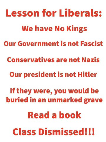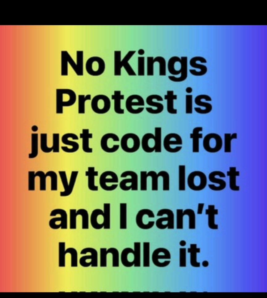 No actually it is not. That is your story, the MAGA cult line fed to you, based upon projecting of the actions of MAGA when Trump lost. We are protesting assaults on our constitution, due process, free speech, emoluments clause violations, extrajudicial arrests & killings, the dismantling of the checks, balances and non-partisan oversight entities. It’s about the detention & arrest of American citizens without just cause or warrant. And so much more like the oligarchs consolidating our entertainment and journalism into one big beautiful profitable propaganda machine. It’s about the violation of Posee commitatus and using the military on our streets against citizens without cause. It’s not about being a sore loser screaming it’s a witch hunt. It’s about freedom, honesty, transparency, ethics, our constitutional rights. The No Kings Protests are a code word for actual First Amendment Patriotism and fighting for rights you haven’t even realized are being taken from you.
