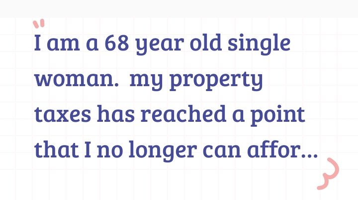 I am a 68 year old single woman. my property taxes has reached a point that I no longer can afford to live in my paid off home . Do I pay Taxes or Insurance? I can not handle both. Taxes will take my home if I don't pay. Insurance will take my home only if I have a horrible mishap. so I have no insurance. I can barely afford to eat, I do have a doggie, I will feed if I eat. Thank You for Your Attention to this Matter. I do appreciate your work to help out. I should never have to sell my home to afford to live. I am thinking of that as a way of survival. I've worked to hard in my life to have to sell my home because of taxes and insurance. Thank You.