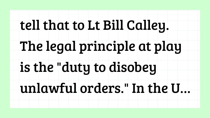 tell that to Lt Bill Calley. The legal principle at play is the "duty to disobey unlawful orders." In the U.S. military, following a superior's order is mandatory, but this obligation only applies to lawful orders. An order is unlawful if it is patently illegal, such as one that directs the commission of a crime or violates the U.S. Constitution or international law (like the laws of war/Geneva Conventions). The My Lai Precedent The My Lai Massacre is the most significant historical case that established the modern legal standard for American soldiers in this context: