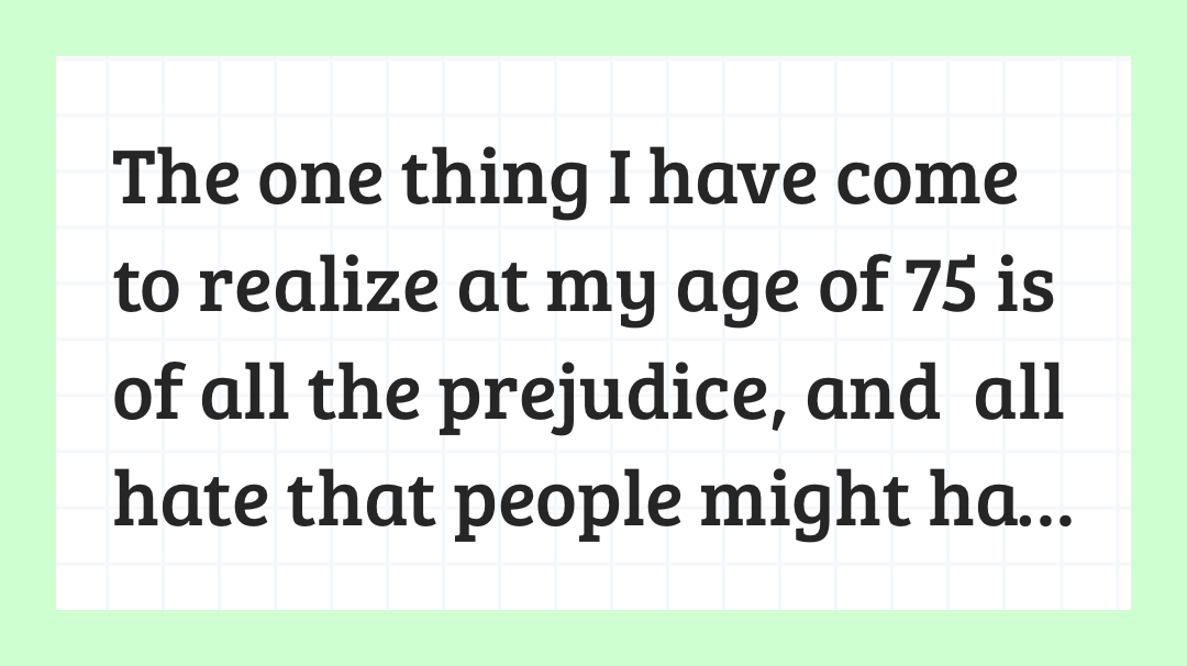 The one thing I have come to realize at my age of 75 is of all the prejudice, and all hate that people might have of other countries and other people the most hated people Americans hate are poor Americans, any American that is in need if they are on Ebt or have any kind of assistance, there will be prejudice to go with it and there will be hate and jealousy as if that’s something to be jealous of, our country has lost heart sadly