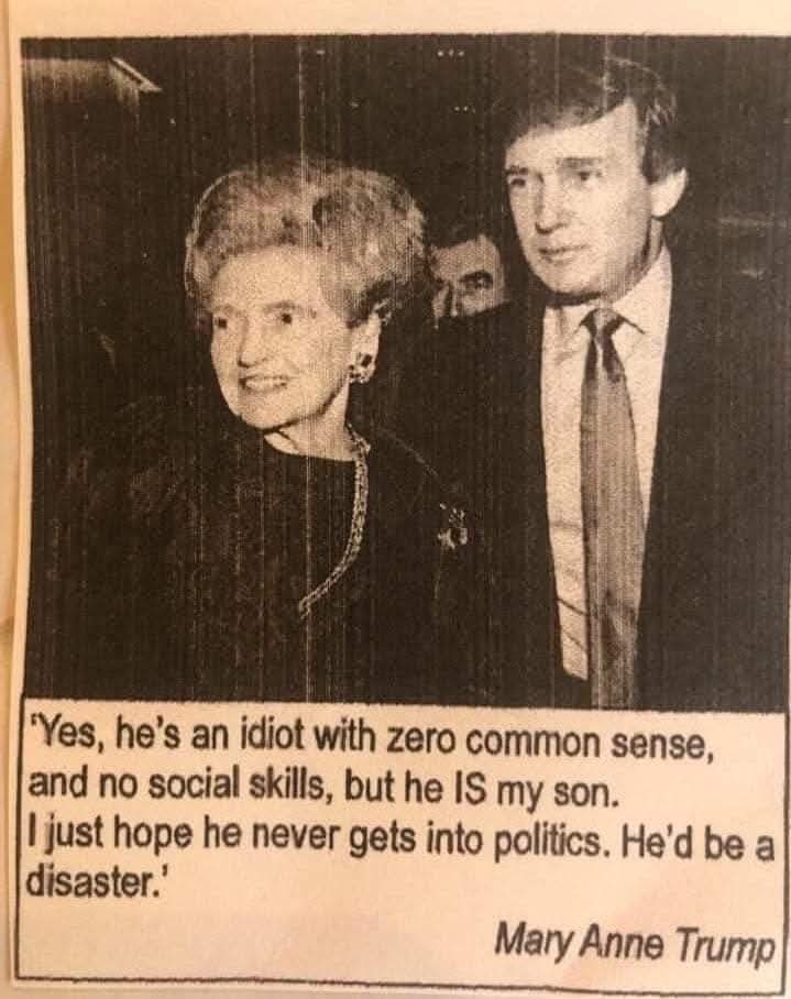 In December 2019, a meme featuring a quote ostensibly uttered by Mary Anne Trump, in which she once called her son and former U.S. President Donald Trump an idiot who should never go into politics, was circulated on social media: