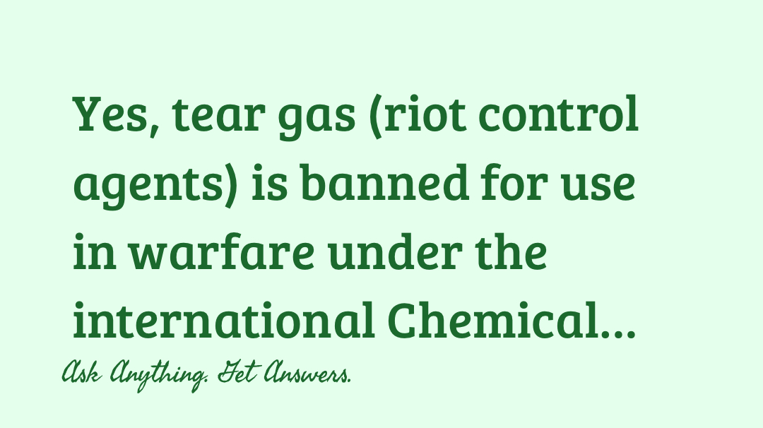 Yes, tear gas (riot control agents) is banned for use in warfare under the international Chemical Weapons Convention (CWC) (1993) but is explicitly permitted for domestic law enforcement and riot control purposes, a compromise that remains controversial. While the Geneva Protocol (1925) also prohibited its use in war, the CWC solidified the ban on military combat, creating a distinction between warfare and domestic policing. Key Points: Banned in Warfare: The Chemical Weapons Convention (CWC) prohibits the use of riot control agents like tear gas as a method of warfare between nations. Permitted in Law Enforcement: The CWC allows for the use of tear gas for domestic law enforcement, including riot control, creating a loophole that many countries utilize. Historical Context: Tear gas was initially developed for military use and saw deployment in conflicts like the Vietnam War, but international treaties later banned it from combat scenarios. Ongoing Debate: Critics argue that the distinction between warfare and policing is arbitrary, as tear gas is often used indiscriminately and can cause significant harm, making its use in domestic situations ethically questionable.