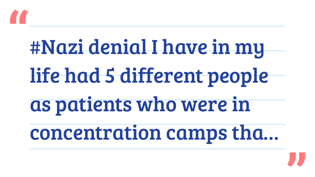 #Nazi denial I have in my life had 5 different people as patients who were in concentration camps that were hell on earth but I always remember the day I had to speak to a surviving elderly woman about her dietary intake. She was seriously sick and the doctor was sure she would do better with a diet. She told me that as a child in the camps she was always hungry but she swore she never be hungry again. So every time someone makes the statement that it didn’t happen the anger is overwhelming. If you take a trip to one of the camps the first thing that you will hear is please don’t pick up a stone because it maybe a part of a human being. People will think it’s okay to say that it didn’t occur. I think it’s just racism and it’s not okay.